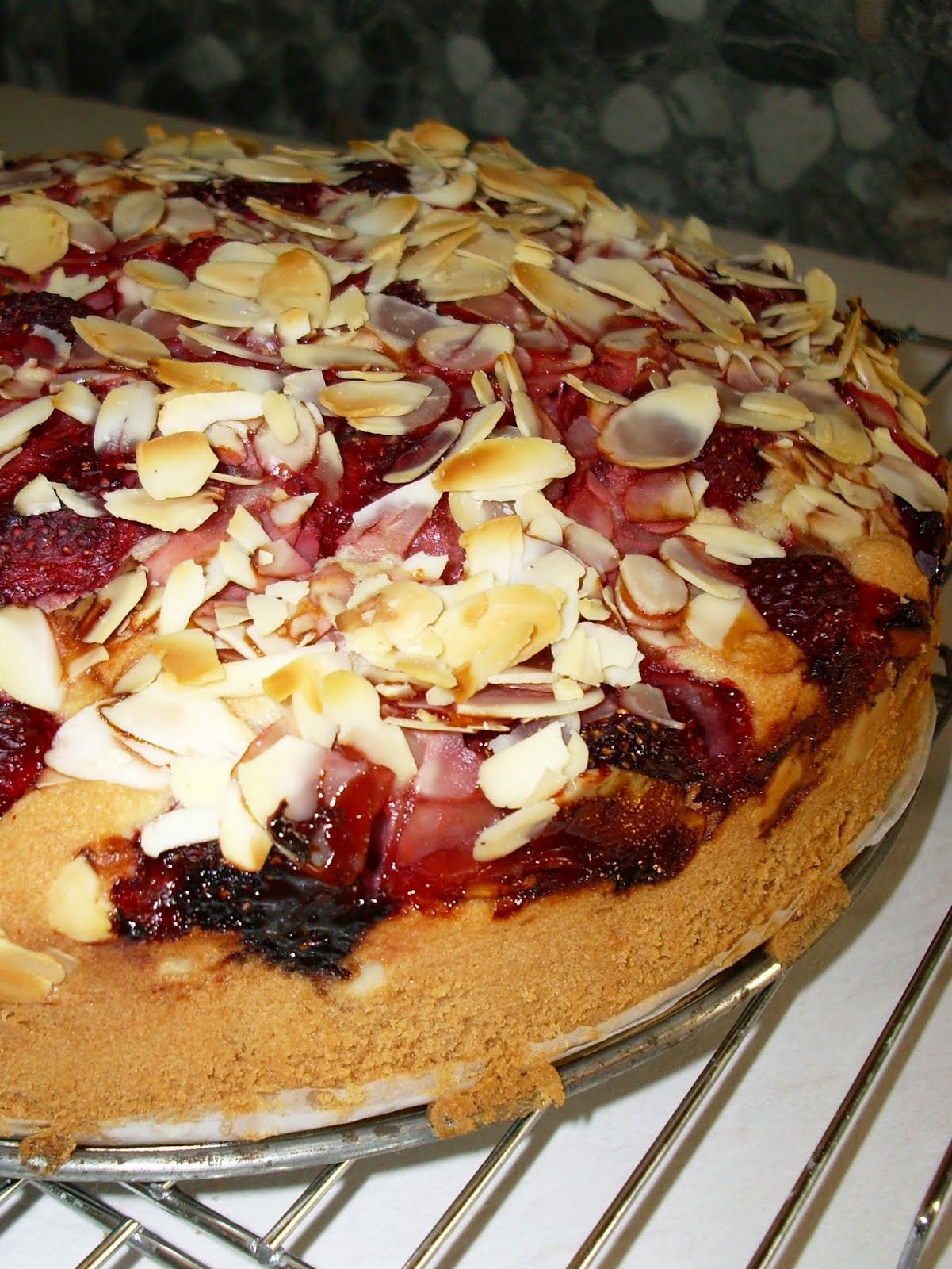 7. Dodać wydrylowane czereśnie i wymieszać łyżką. Masę z owocami przełożyć na zastygnięty spód w tortownicy, wyrównać.